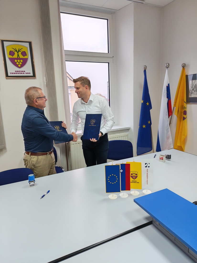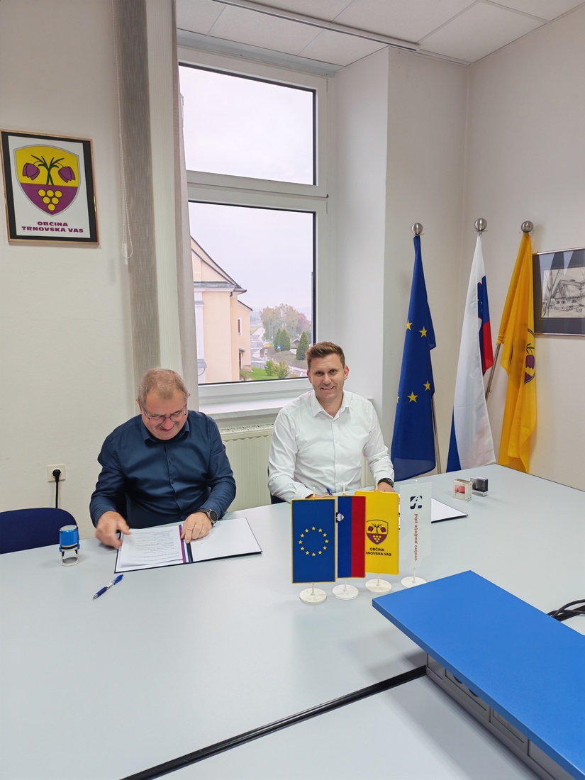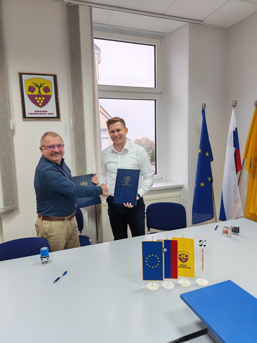 Župan Občine Trnovska vas Alojz Benko in predstavnik izvajalca Cestno podjetje Ptuj d.d. Rok Sagadin sta danes podpisala pogodbo za "Sanacijo plazu Pelcl".