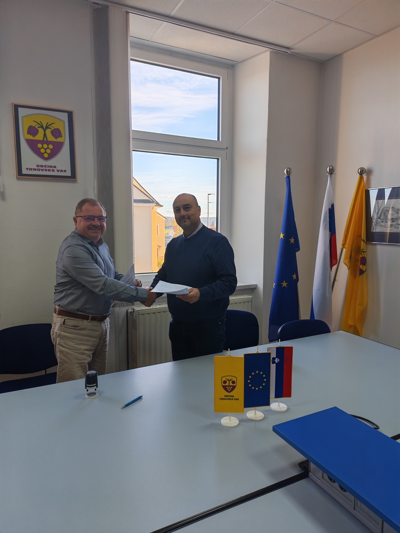 Župan Občine Trnovska vas Alojz Benko in predstavnik podjetja Kokol in Kokol d.o.o. Benjamin Kokol sta podpisala pogodbo za izvedbo meteorne kanalizacije – zadrževalnika v novem naselju v Trnovski vasi.